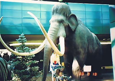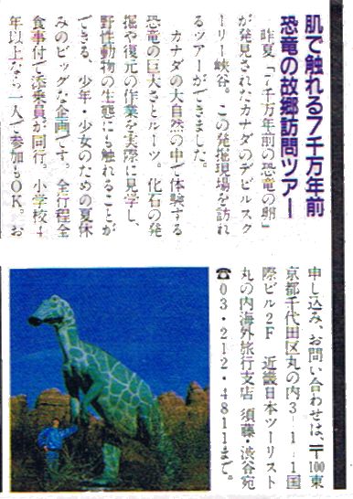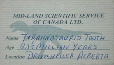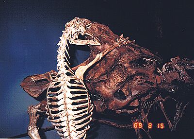 ■8/14・ティラノサウルス ティラノサウルス科、全長10~13m、肉食、白亜紀最末期、北米。ティラノサウルス レックス(Tyrannosaurus rex)は、陸棲肉食動物最大のもので、雌の方が頑丈な体であった。尾の基部の血道弓の長さによって雌雄が判別できる。ドラムヘラーより上流のハックスレーで1981年に発掘され、頭部はまだ岩の中だが、ほぼ完全な標本の一つ。 |