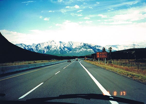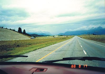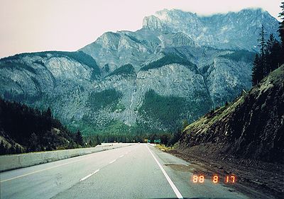■8/17・夕食場所・カナナスキスへ向かう 1号線をバンフからカルガリーに向かう。バンフ南東のカナナスキスにある「カナナスキスゲストランチ(Kananaskis Guest Ranch)」で夕食。ドーナツテントで食べる本場のカウボーイ料理、農業用フォークに刺した牛肉の丸焼きがびっくり。薄暗い森の中での夕食も、野趣あふれて大変良かった。 |