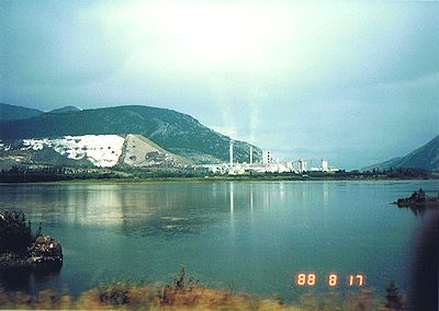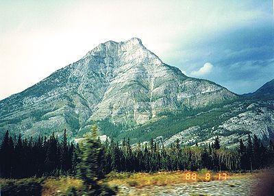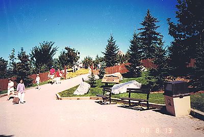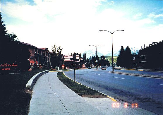 ■8/17・カスケード・ロック・ガーデン バンフ市内のボー川を越えた南にある、カスケード・ロック・ガーデン(Cascade Rock Garden)からバンフアベニュー(Banff Avenue)を見る。 正面には、カスケード山(Cascade Mauntain)2998mがそびえる。 |