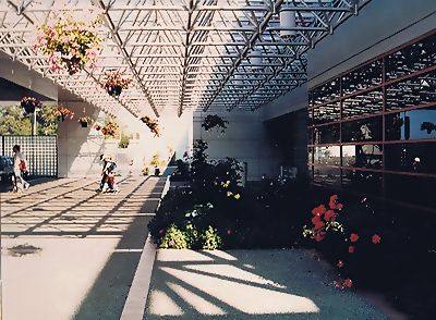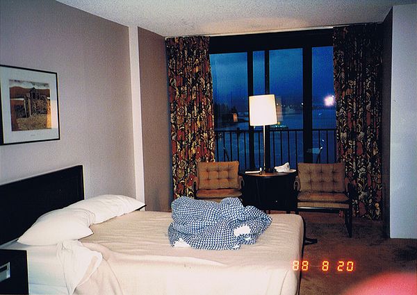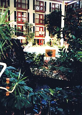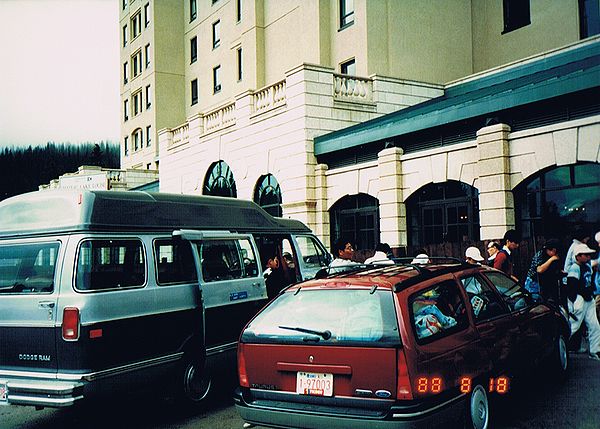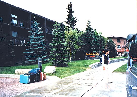 ■8/15・レスブリッジ・ロッジ・ホテル 恐竜公園からレスブリッジに移動し、レスブリッジ・ロッジ・ホテルに到着。中が吹き抜けになっており、中庭には、プールなどがあった。 |