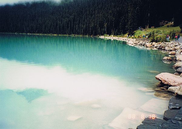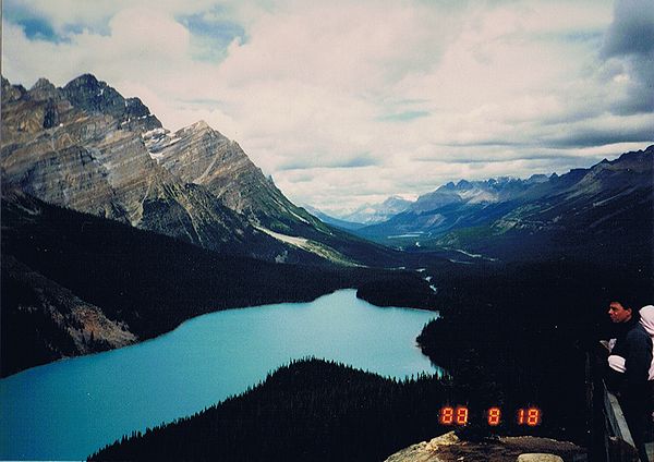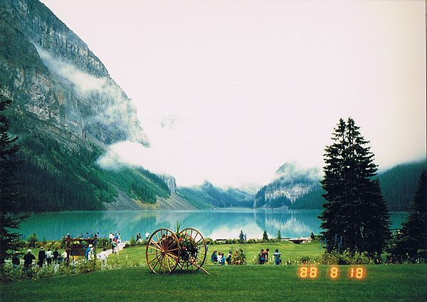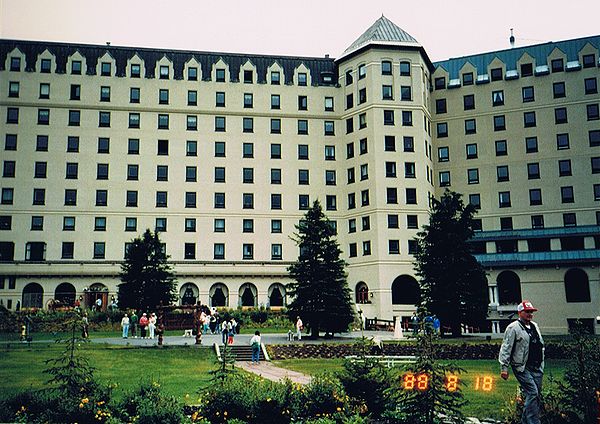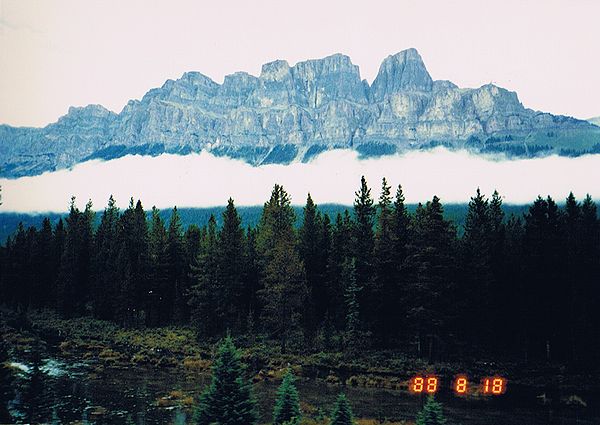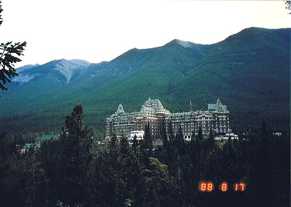 ■8/17・バンフ・スプリングス・ホテル バンフ市内の南東にある、トンネルマウンテンドライブのビューポイントから、有名なバンフ・スプリングス・ホテル(Banff Springs Hotel)を見る。 緑の山と森林に囲まれた古城風のホテルは、幻想的である。 |