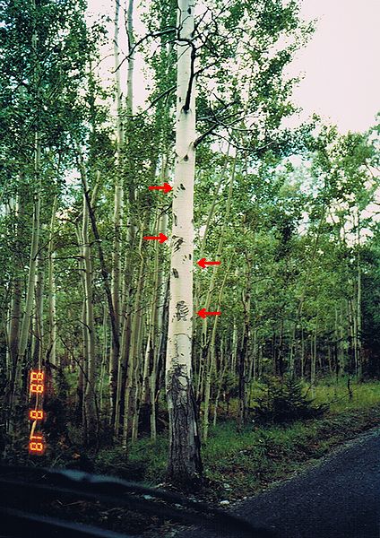 ■8/18・バッファロー・パドック バンフ市内の北東にあるバッファロー・パドック。 柵で囲まれた広い土地の中にバッファローが放し飼いになっている。 近くの白樺の木に熊の爪痕(矢印)が見られた。 熊の縄張りを表す印だとのこと。 |