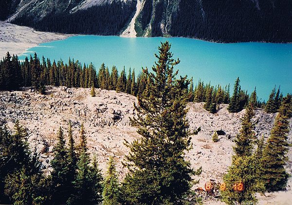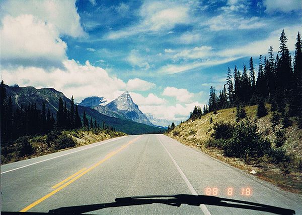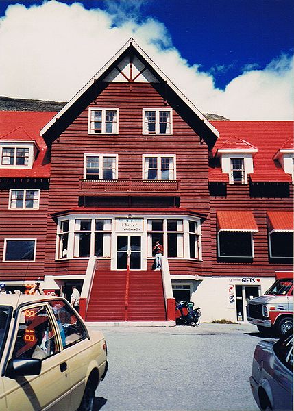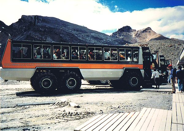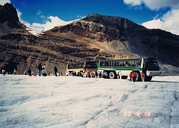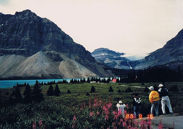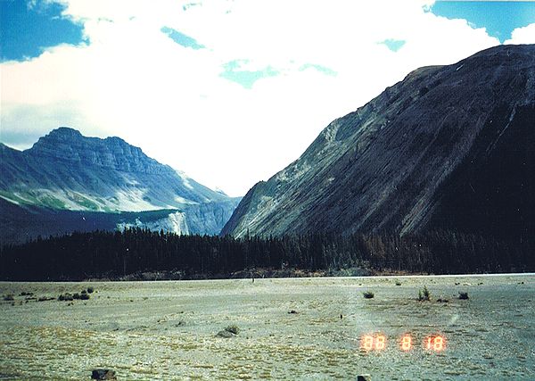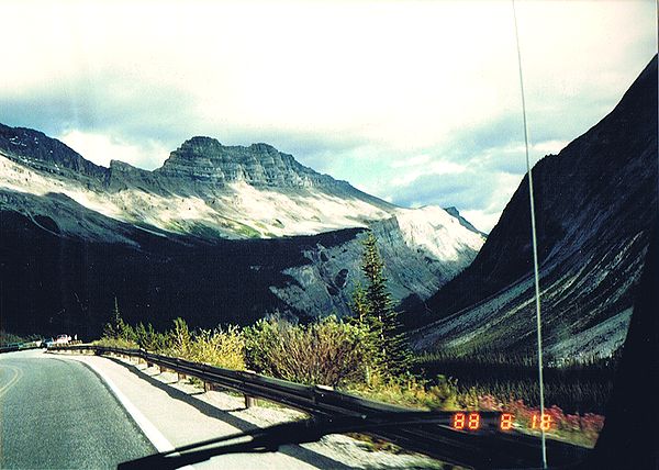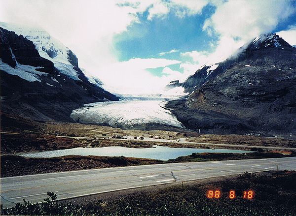 ■8/18・コロンビア・アイスフィールド・シャレー コロンビア大氷原に到着、1937年に建てられた山小屋風の建物(シャレー)の前に車を止める。 赤い屋根のシャレーは遠くからもよく目立つ。 1階のギフトショップでは、ロッキー山脈中から発掘された、カンブリア紀の化石が多く売られていた。 1937年当時、コロンビア大氷原の先端は、このシャレー付近まであったとのこと。 地球温暖化で氷河は退行し、現在は遥か彼方になっている。 |