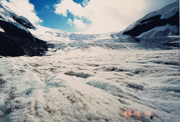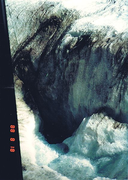 ■8/18・コロンビア氷河のスノーホール スノーモービルから見たスノーホール。 コロンビア大氷原の中にはクレバスが多く、50m下の氷河の底まで穴が空いていて、溶けた水が流れ込み、氷河の底から下流に流れている。 まれに、落ちる人もいるとか、しかしほとんど助けられず、数十年から100年後ぐらいに氷河の末端に出てくるという。 怖い話である。 |