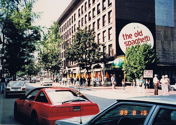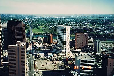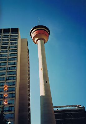 ■8/13・カルガリータワー 8/13、7時30分朝食の後、9時に歩いてカルガリータワーに向かう。下から見上げたカルガリータワー、入場料は、2.75C$(約300円ぐらい)であった。 |