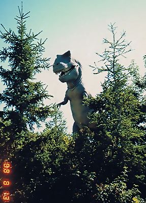 ■8/13・ティラノサウルス ティラノサウルス科、全長10~13m、肉食。 針葉樹の森の中に出現した、ティラノサウルス レックス(Tyrannosaurus rex)、立ち姿は、古い体型である。 現在の復元姿勢とは異なるが、充分迫力がある。周囲の針葉樹が小さめなので白亜紀の森の中に出現した雰囲気が良く出ている。 ちょっと頭でっかちか? 白亜紀最末期の肉食竜の中で最大のもの。 眼窩が前方を向き立体視の能力があったと考えられている。眼窩上突起がやや強調されている。 |