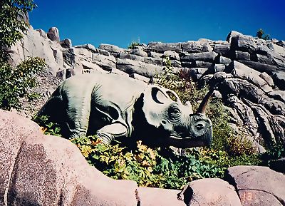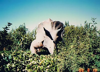 ■8/15・カスモサウルス ケラトプス科、全長5m、草食。 カスモサウルス ベリー(Chasmosaurus belli)は、長いえり飾りと細長い顔面が特徴であり、長い2本の眼上角と鼻角を持つ。写真の眼上角は短くすらりとした顔面なので雌と思われる。白亜紀末期に北米で繁栄した。動きのある展示の仕方である。 |