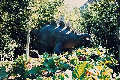 ■8/13・ステゴサウルス ステゴサウルス科、全長9m、草食。 ジュラ紀後期の森の中に出現した、ステゴサウルス ステノプス(Stegosaurus stenopus)背中には、大きな五角形の骨板が交互に並び、尾の先には1mほどのスパイクが2対ついている。皮膚上には、防御用の装甲と考えられる小骨片や硬いコブがあり、首の下面にも多くの小骨片が存在していた。 |