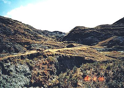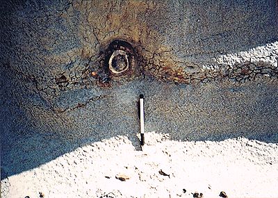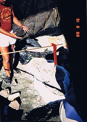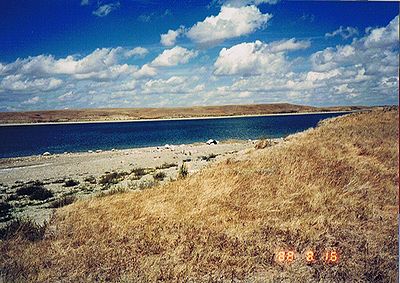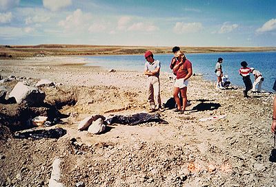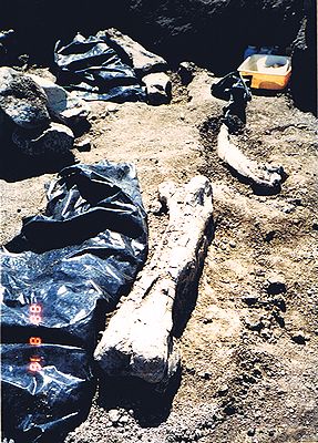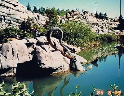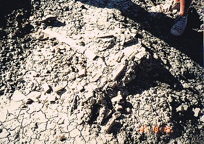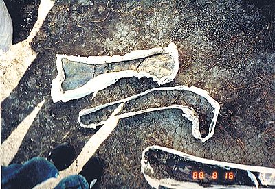■8/16・骨化石の発掘現場 デビルズクーリーより上位の地層にあたると思われる。 かなり大型(長さ1.2m)の恐竜の足の骨化石が露出している。 セッコウのジャケットも被せてない、黒いビニールで覆っているだけである。 発掘する余裕がないようだ。 この辺の至る所に恐竜の骨化石が転がっていた。 貯水池の澄んだ水の底にもはっきりと骨化石の破片が見えた。 かなり広範囲によく観察したが、歯の化石等をまったく見つけることができなかった。 博物館員が採集してしまったのか。 |
