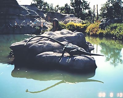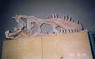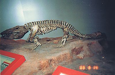 ■8/15・チャンプソサウルス エントランスに展示してあったチャンプソサウルス。 双弓類、鱗竜類、有鱗類、トカゲ類、全長1.8~2.5m、魚食。 チャンプソサウルス(Champsosaurus )は、淡水の湖や川に生息し、水陸両生であった。 長い顎と尖った歯から、魚を食べていたと考えられる。 白亜紀後期に北米で繁栄し、新生代始新世まで(7000万年前~4000万年前)生き延びた。 |
