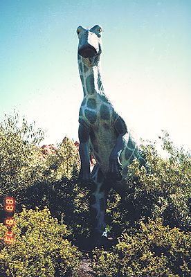 ■8/13・アパトサウルス ディプロドクス科、全長21m、草食。ジュラ紀後期、ユタ州で見つかるアパトサウルス ロウイサエ(Apatosaurus louisae)、旧称「ブロントサウルス」。ディプロドクスに似た小さな頭骨の上部に鼻孔が開口し、釘状の前歯が特徴である。足跡の化石から、群れで生活していたと考えられる。 |