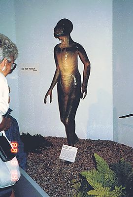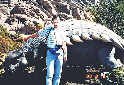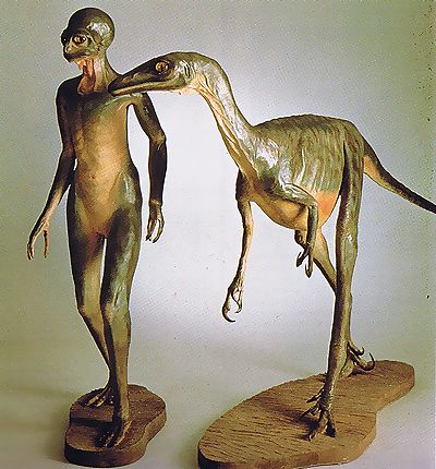 ■8/14・恐竜人間(dinosauroid) ティレル博物館のscience hall に展示してある恐竜人間(ダイノサウロイド)。 白亜紀末期の獣脚類ステニコサウルス(Stenonychosaurus)は、最も賢い恐竜と考えられ、絶滅せずに進化したら、このような恐竜人間になったと想像された。 作者は、芸術家のロン セーガン(Ron Seguin)と古生物学者のデール ラッセル(Dale Russell)である。 ステノニコサウルスは、現在トロオドン(Troodon)と同じ恐竜と考えられ、トロオドンに統一された。 大きな目は、前を向き、立体視ができたと考えられる。体重と脳重を比べると恐竜の中では、最も脳重の比率が大きく、恐竜人間の元となった。 |