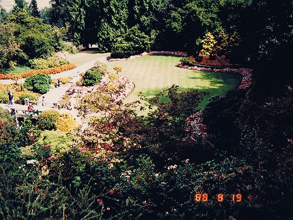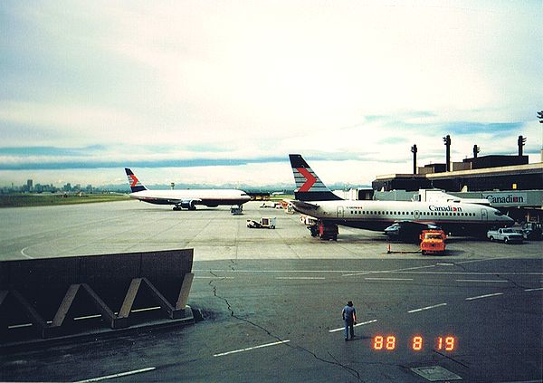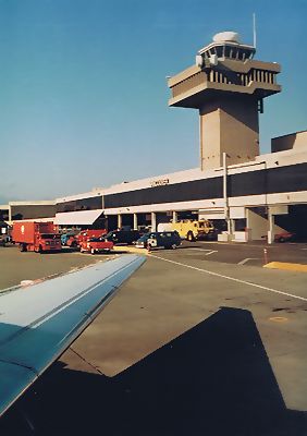 ■8/12・バンクーバー国際空港管制塔 15時にバスでバンクーバー国際空港に着いた後、18時、エアー カナダのAC216便で、カルガリーに向かう。飛行機の窓から撮影した管制塔。20時17分にカルガリー空港に着いた。バスに乗り、21時15分、デルタ ボウ ホテルに着いた。時差ぼけで、眠かったがホテルのレストランで夕食を取り、すぐに寝る。 |