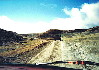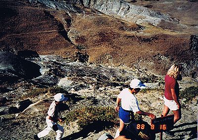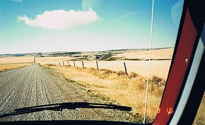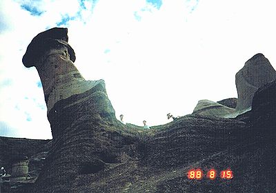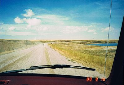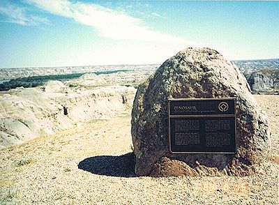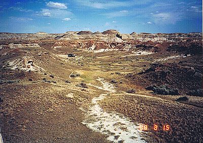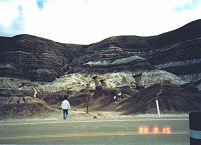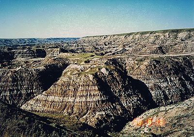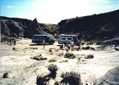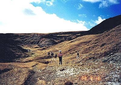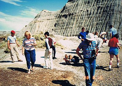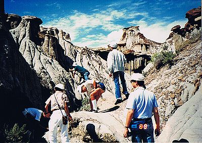 ■8/15・自由見学路で車から降り見学 立ち入り禁止区域内を見学した後、ティレル博物館員と別れ、自由見学路を回る。 係員がいないので丘に登ったり、至る所をなめ回すように恐竜化石を見つけようとする。 あちこちに恐竜化石の破片は落ちている。 |