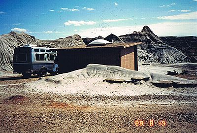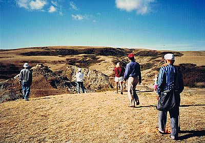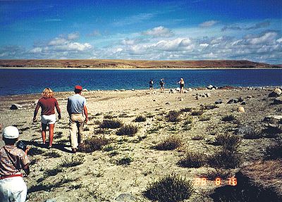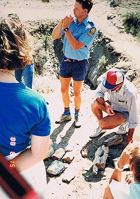 ■8/15・ティレル博物館員がマイクロサイトを案内 ティレル博物館員(女性)がマイクロサイトを案内し、表面に落ちている化石を拾い、見せるように指示した。 しかし、持ち帰りは許されず、貴重なもの(恐竜?の足の骨と亀の甲羅)は、フィールドステーションに持ち帰り、その他はその場に捨てさせられた。 |