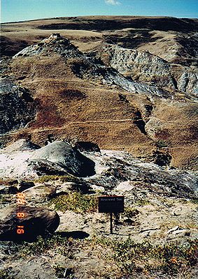 ■8/16・卵と巣の化石の発見地 崖を降りる途中、写真の中央に黒い覆いが掛けられているところが恐竜の卵や巣の発見地である。 谷を挟んだ向こう側の崖の斜面にも発掘した跡があり、広範囲に巣があったことがわかる。 1987年に女子大生であるウェンディ・スロポーダが発見した。 14の巣が見つかり、中からヒパクロサウルス(Hypacrosaurus)の幼体(孵化直後)の化石や、周囲から子供や大人の化石も発見されている。 |