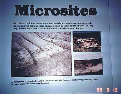 ■8/15・マイクロサイト マイクロサイトの説明パネル。 大きな骨格化石だけでなく、小さな化石も恐竜の生態や、古環境を復元するには大変重要である。 小さな脊椎動物の化石が密集したところをマイクロサイトと呼ぶ。 歯の化石や指の化石、魚の鱗などが多く発見できる。 |