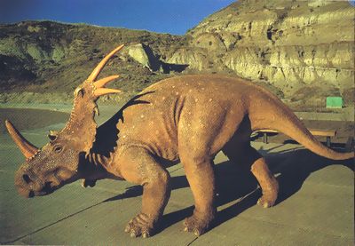 ■8/13・スティラコサウルス ケラトプス科、全長5m、草食。白亜紀後期、アルバータ州で見つかるスティラコサウルス アルバーテンシス(Styracosaurus albertensis)、オスは派手なえり飾りを持つ。縁の上部にスパイク6本が角状に飛び出し、大きい開口部が発達した短いえり飾りが特徴。眼上角はなく、鼻角は良く発達し長い。群れで生活していたと考えられ、ボーンベッドが発見されている。 |