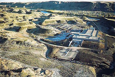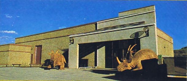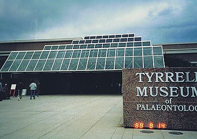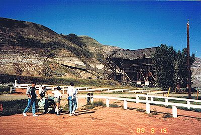 ■8/15・恐竜公園内を見学、ディスプレイハウス ティレル博物館員の案内で恐竜公園内を見学する。ディスプレイハウス(Display House)には、発掘した恐竜化石が地層の中にそのまま保存されている。 |