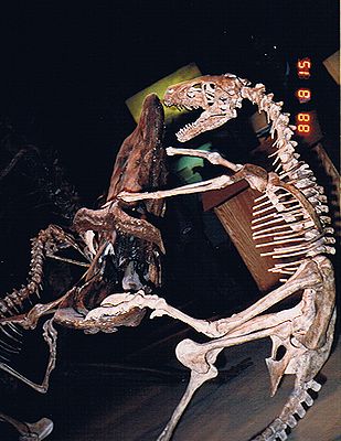 ■8/15・ランベオサウルスを襲うドロマエオサウルス ドロマエオサウルス科、全長1.8m、肉食、白亜紀末期。 頭骨は、高さも横幅もあり、頑丈で、ティラノサウルスに似ている。歯の数も少なく大きい。 口による攻撃が専門だったことを伺わせる。 |