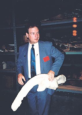 ■8/14・ティレル博物館バックヤード見学 博物館に入ると会議室に案内され、教育サービス係長のシッド・アンドリュース(Sid Andrews)氏から発掘調査などの説明を受ける。 その後、一般の人は見ることのできないバックヤードに入る。 化石保管庫の中でケラトプス科のパキリノサウルス カナデンシス(Pachyrhinosaurus canadensis)の腸骨(ilium)の複製(プラスチック製)を腰に当てて説明するアンドリュース氏。 後ろの棚には、クリーニングと保護処理がされた、実物の恐竜化石や、複製を作成する型などが保管されている。 |