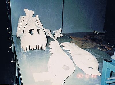 ■8/14・アルバートサウルスの複製 ティレル博物館のバックヤードのテーブルの上に並べられたアルバートサウルス リブラタスの頭蓋骨と下顎の白いプラスチック製の複製。 |