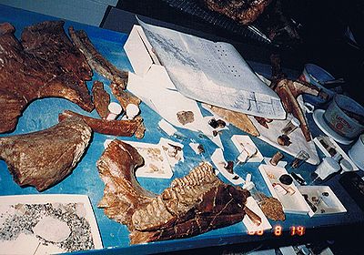 ■8/14・ブラック・ビューティー ティレル博物館のバックヤードでクリーニング中のブラック・ビューティー、ティラノサウルス レックス(Tyrannosaurus rex)のほぼ完全な頭蓋骨。岩が結構硬く、1982年に発掘し、2年間もクリーニングを続けている。クローズネスト峠の白亜紀最末期の流されて堆積した地層から産出。黒光りする歯がかなり大きく完璧な状態である。 |
