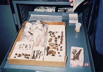 ■8/14・チャンプソサウルス クリーニング、保護処理を施し、保管棚の引き出しの中に並べられたチャンプソサウルス(Champsosaurus )の全身骨格の実物化石。 白亜紀後期、体長60~70cm、ワニの仲間の水生爬虫類。 魚を食べていたと考えられる。 右の白い箱の中に頭骨が入っている。 |