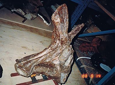 ■8/14・ラムベオサウルス クリーニング、保護処理を施し、保管棚の中に置かれたラムベオサウルス ラムベイ(Lambeosaurus lambei)の頭骨の実物化石。 白亜紀後期、全長9m、草食。良く発達した二股のトサカが特徴で、内部に鼻道が通り、大部分が前上顎骨で形成されている。ディスプレイや鳴き声の共鳴器官として使われ、性別や年齢によって、トサカの形状に違いがある。 |