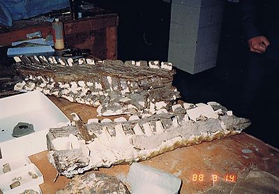 ■8/14・ラムベオサウルス テーブルの上に置かれた石膏のカバーが付いたラムベオサウルス ラムベイの連続した尾椎(caudal vertebrae)の実物化石。 筋肉・腱の化石が残っている。神経棘(neural spine)を挟むように束になった細長い筋状のものがそうである。この腱のおかげで尾がピンと水平に保たれている。 |