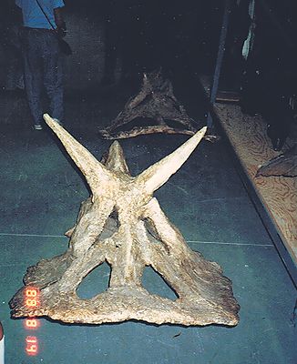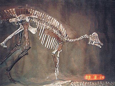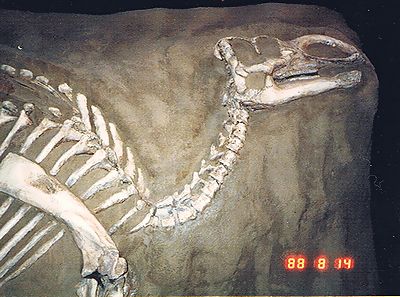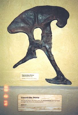 ■8/14・鳥盤類の骨盤 鳥盤類の骨盤は、腸骨の下の前部(写真では右)に二股になった恥骨が付き、前方に向いているのが前恥骨突起で、後方を向いているのが後恥骨である。腸骨の下の後部に後方を向いて坐骨が付く。後恥骨と坐骨が平行になる。 |