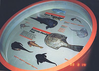 ■8/14・デボン紀の魚類 デボン紀に魚類は、多様な形を作って発展した。 中央の大きなものは、ドレパナスピス(Drepanaspis)で、ヨーロッパから産出する。異甲目、ドレパナスピス科、全長50cm~1m、デボン紀前期。左下は、胴甲目、ボトレオレピス(Bothryolepis)で、ヨーロッパ、北アメリカなどから産出する。全長40~50cm、デボン紀中期から後期。 |