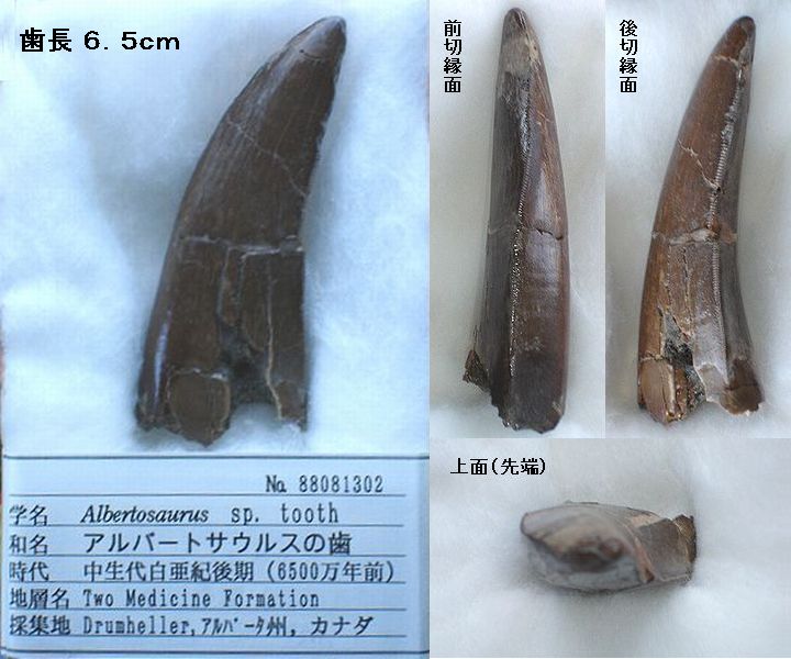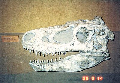 ■8/14・アルバートサウルスの頭骨 ティラノサウルス科、全長7~8m、肉食。 アルバートサウルス リブラトゥス(Albertosaurus libratus)は、ゴルゴサウルスとして有名になったものと同じである。ティラノサウルスより細身で軽量、頭骨も幅が狭く、眼はそれほど前向きではない。歯の数は多かった。 白亜紀最末期に北米で繁栄した。 |