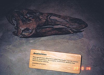 ■8/14・アナトティタン ハドロサウルス科、全長9m、草食。 アナトティタン コーペイ(Anatotitan copei)は、旧名アナトサウルス。また、エドモントサウルスは、同じものと考えられている。アヒルに似たハドロサウルス科で最も長く幅広のくちばしを持つのが特徴である。ミイラ化した化石が発見され、皮膚のモザイク状の小結節が均一で背中に行くほど大きくなることもわかった。白亜紀最末期に北米で繁栄した。 |