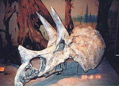 ■8/14・トリケラトプスの頭骨 ケラトプス科、全長8~9m、草食。 トリケラトプス ホリダス(Triceratops horridus)は、幅広の短いえり飾りと良く発達した頑丈な眼上角と短い鼻角が特徴。白亜紀最末期に北米で繁栄した。 |