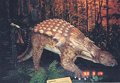 ■8/14・エドモントニア ノドサウルス科、全長7m、草食。 エドモントニア ロンギセプス(Edmontonia longiceps)は、頭骨と前半身の装甲が発見されている。吻部の先端は、幅広でくちばし状に突き出している。首から肩にかけ、中央に隆起のある大型の骨板が左右対称に3列並び、側面には4対のスパイクが突き出ている。白亜紀末期に北米で繁栄した。 |