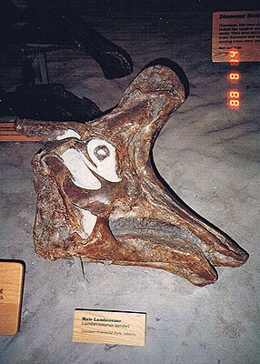 ■8/14・ランベオサウルスの頭骨 ハドロサウルス科、全長9m、草食。 ラムベオサウルス ラムベイ(Lambeosaurus lambei)の頭骨。 良く発達した二股のトサカが特徴で、内部に鼻道が通り、大部分が前上顎骨で形成されている。 ディスプレイや鳴き声の共鳴器官として使われ、性別や年齢によって、トサカの形状に違いがある。 前肢は、長く4本指、後肢は、3本指である。 白亜紀末期に北米で繁栄した。 |