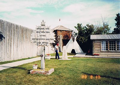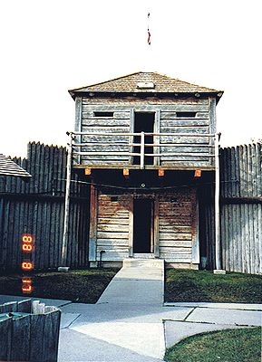 ■8/17・フォート博物館・トーチカ レスブリッジから3号線を西に進み、フォート・マクレオドにある、1956年に創設された博物館。 1873年に編成されたノースウェスト騎馬警官隊の博物館である。 入口脇にある砦の角の要塞「トーチカ」(Corner Blockhouses)。 |