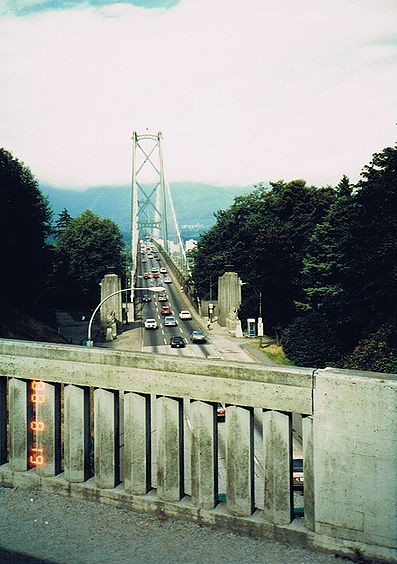 ■8/19・ライオンズ・ゲート・ブリッジ バンクーバーの北西に位置するスタンレー・パーク(Stanley Park)のプロスペクト・ポイント(Prospect Point)から見たライオンズ・ゲート・ブリッジ。 バラード入江の入口ファースト海峡に架かる橋。 橋の入口両側にライオンの像がある。橋の向こう側は、ノースバンクーバーである。 橋の上は、3車線道路で、時間によって上り2車線、下り1車線、又は逆になる。 時間帯によっては日本並みの渋滞になるとか。 |