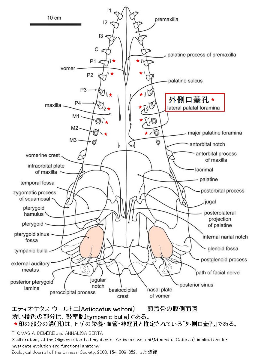 | 上の画像は、エティオケタス ウェルトニ(Aetiocetus weltoni)の頭蓋骨の腹側面図であ る。エティオケタスは、漸新世(3400万年前~2300万年前)に生存していた、歯のある ヒゲクジラの祖先とされている。1990年、北海道足寄町茂螺湾の漸新世後期(2800万年前~ 2300万年前)の川上層群茂螺湾(もらわん)層からも発見されている。上の画像で、赤い星印 の部分の溝(孔)は、「外側口蓋孔(Lateral palatal foramina)」と呼ばれ、ヒゲへの血管・ 神経孔と想定されているものである。一説によると、上顎歯の内側に肥大化した歯茎とケラ チン質の突起があり、ヒゲの役割をして、捉えた獲物を逃がさないようにする工夫であった とのことである。つまり、エティオケタスは、歯とヒゲの両方を持っていたとのことである。 やがて、歯が退化してヒゲだけになったものが、現在のヒゲクジラとのことである。現存す るヒゲクジラは、出生時には歯がないが、発達初期の胎児には歯があり、胎児の発達に伴い 脱落していくとのことである。 |