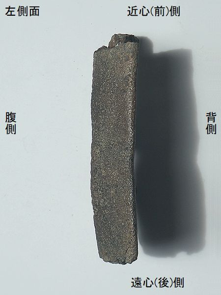 奈倉層の泥質砂岩を割って発見。この場所 からクジラやアザラシ、カメの化石が出て いた。サメの歯も結構出ている。腹側は、 滑らかな平面が長屋根型に100度の角度で 接する。接する線は、直線で緩やかに背側 に反る。背側は、V字型に凹み、底は丸み を帯びて凹みややうねっている。骨の表面 に、近心に向かって収束するような筋が見 られる。遠心縁は、破断して摩滅している。 近心縁は、採集の際に破断した。断面では、 左右が非対称である。付近から1979年、ヒ ゲクジラの頭骨の化石が、見つかっている。 |
