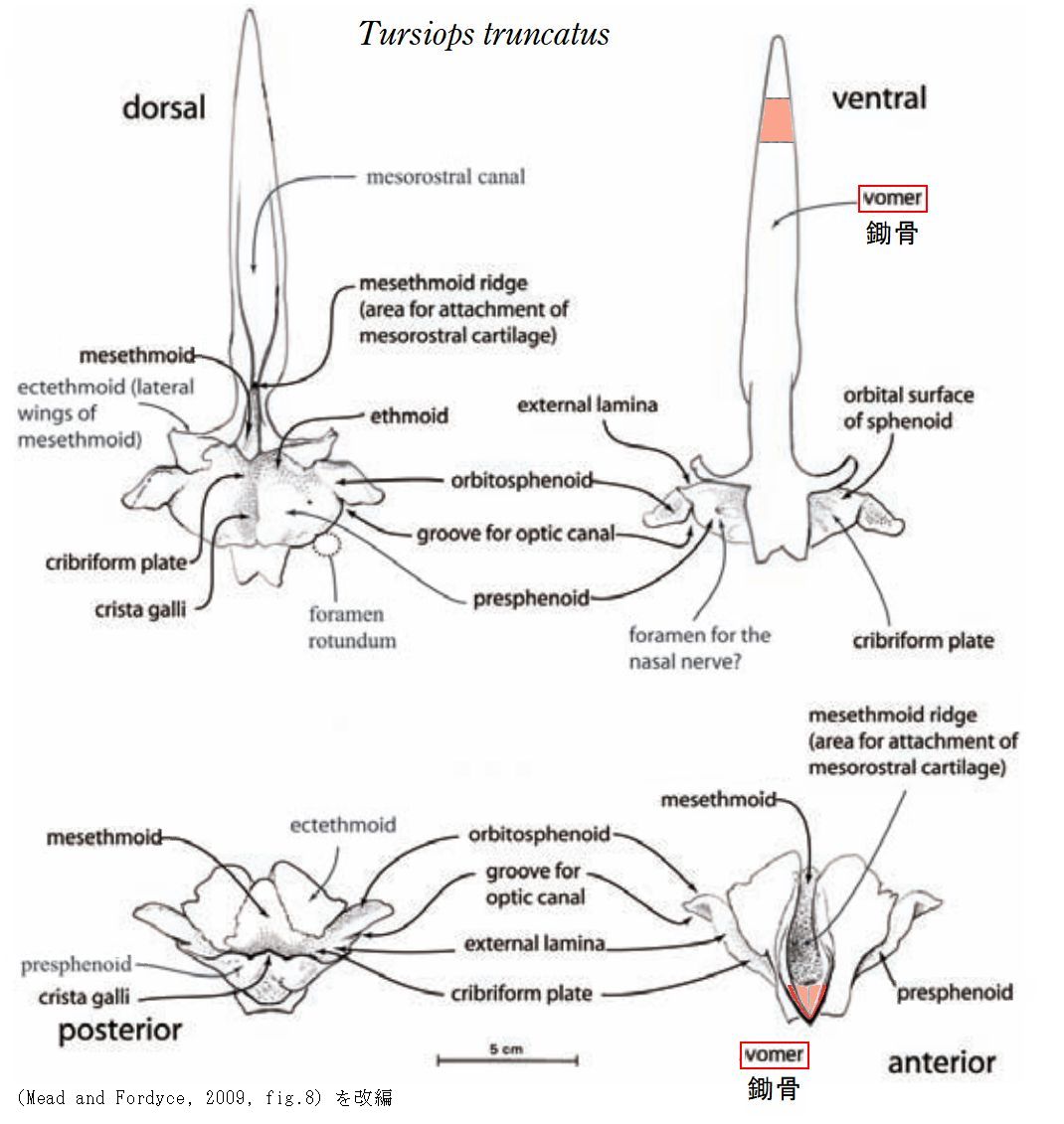 | 上の画像は、マイルカ科のハンドウイルカの頭骨の解体図である。中央の前頭 骨から前方に伸びた細長い部分が、鋤骨である。下の画像は、ハンドウイルカ の前頭骨を4方向から表した図である。ハンドウイルカは、ハクジラであるが、 ヒゲクジラもほぼ同様な位置に鋤骨がある。標本No.93080503の鋤骨は、赤 く示した部分に相当すると思われる。 |