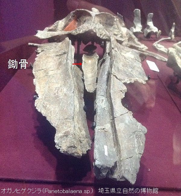 | 上の画像は、1982年、秩父郡小鹿野町般若の丘公園から産出した、ヒゲ クジラ亜目、ケトテリウム類のパリエトバラエナ属の頭骨である。中央に 鋤骨が見られる。秩父町層群奈倉層からの産出である。当時、旧秩父セメ ントの採石場で作業員により発見され、埼玉県立自然史博物館に寄贈され たものである。現在の埼玉県立自然の博物館に展示してある。 |