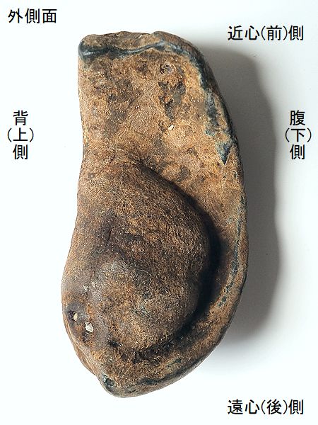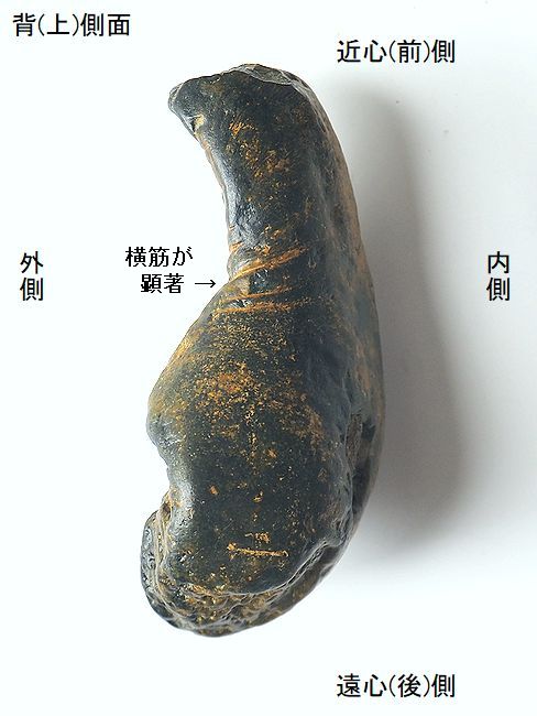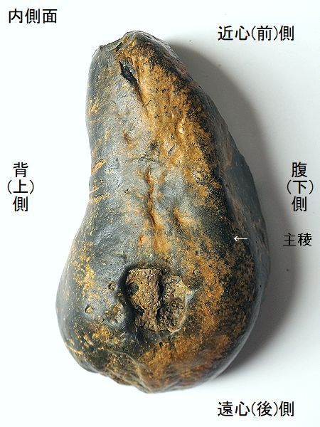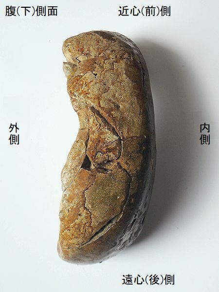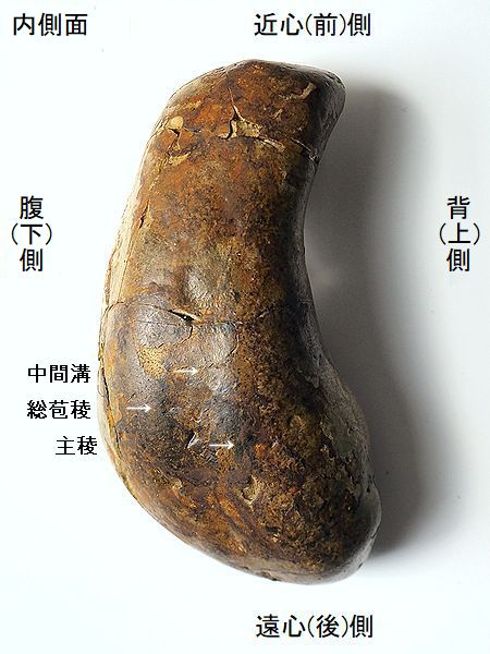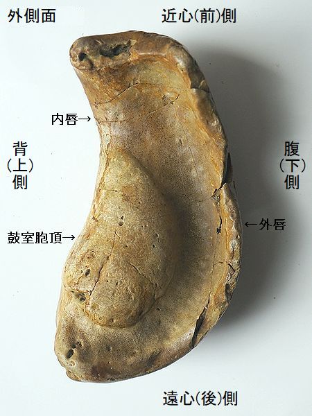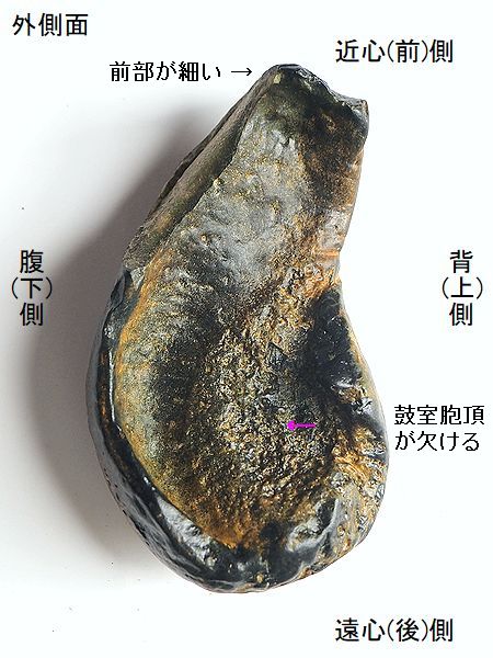 | 標本No.95072801 ミンククジラの右鼓室胞 Balaenoptera sp. tympanic bulla 千葉県銚子市長崎鼻 鮮新世・500万年前 犬吠層群・名洗層 長さ:94.3mm、 幅:49.8mm、 厚さ:39.9mm、 重さ:167g |  |  |  |  |  |  |  | 大潮で露出した海底の礫岩層か ら掘り出したもので、一部割れ てしまい接着。外唇の多くが割 れてから、摩滅が進んでいる。 内側面の総苞稜が明瞭である。 主稜の後端は、顕著に後方に突 出している。総苞稜と主稜の間 (中間溝)は凹んでいる。鼓室内 の鼓室胞頂は、膨らみが少なく、 前部にかけて幅が狭くなる。鼓 室胞頂の後部の溝は、かなり幅 広い。 |