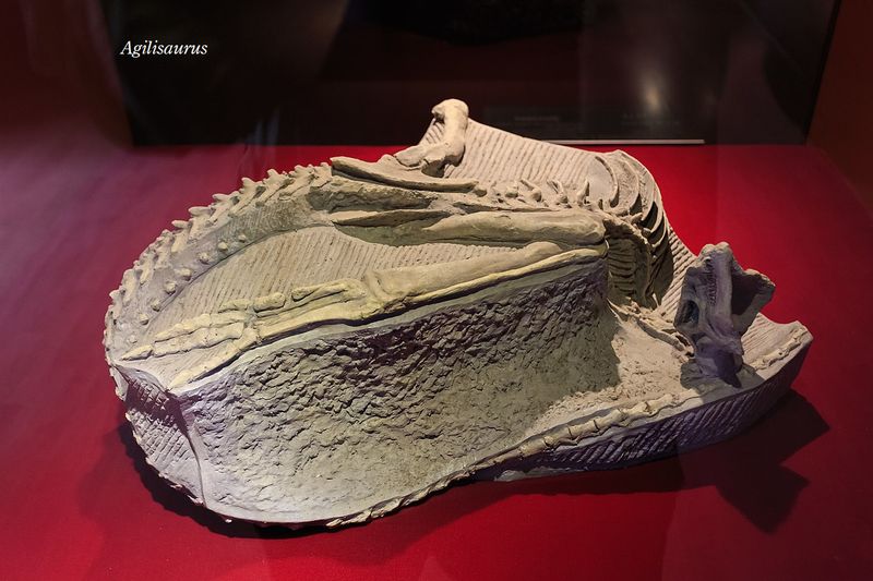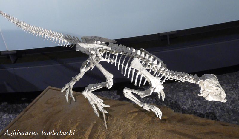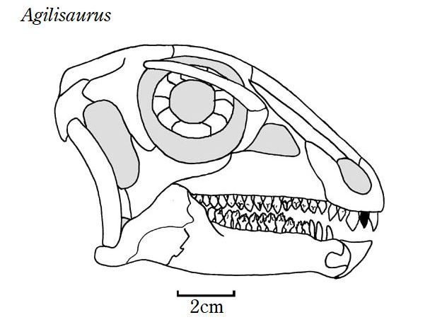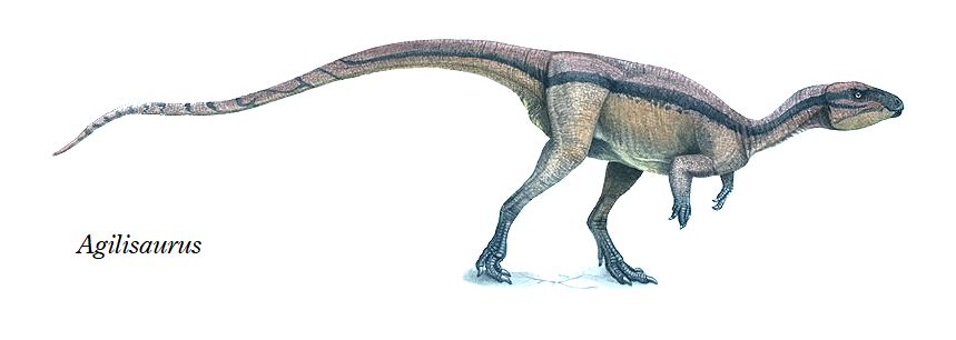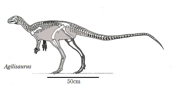 | アギリサウルスは、1990年に、中国、四川省、自貢市、建設中の自貢恐竜 博物館のジュラ紀後期(約1億6500万年前)の下部沙溪廟層(シャキシミア オ層)からに発見された。これまでに発見された中で、最も完全な小さな 鳥盤類の骨格の1つである。非常に速い二足歩行のランナーであった。前 上顎骨と上顎骨の歯の形が異なる。前上顎骨には、5つの釘状の後方に曲 がった歯があり、上顎骨の歯は、前後に歯状突起があり、横から見ると三 角形に近い形になっている。前歯骨には、歯がなく、角質に覆われくちば しのようになっていた。頬歯は、葉の形をしていて、歯の波状のエナメル 質は、おそらく耐摩耗性を高めるために備わった。ヒプシロフォドンに形 が似ているが、より原始的である。全長は、約1.2~1.7m、体重は、約40 Kgと推定されている。 |