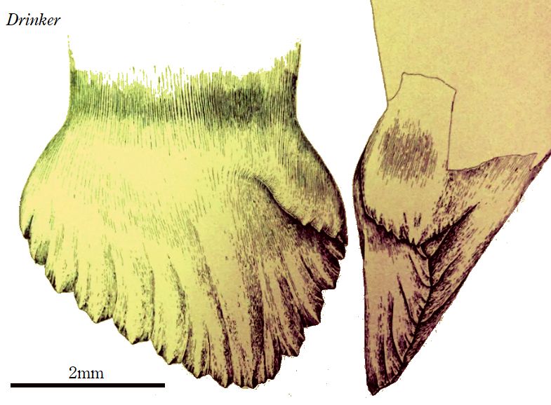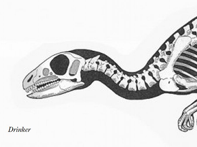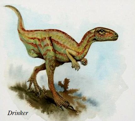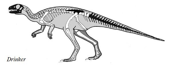 | ドリンカーの化石は、アメリカ、ワイオミング州、コモブラフのメインブ レックファーストベンチ採石場のジュラ紀後期(約1億5600万年前)のモ リソン累層から発見された。化石は、部分的な顎、椎骨および部分的な 手足であった。既知の最小の恐竜の1つであり、二足歩行の草食恐竜であ る。ドリンカーの名前は、科学者として19世紀に、1400以上の論文を発 表した古生物学者エドワード・ドリンカー・コープに敬意を表して名付けら れた。数個体の、かなり完全な化石が知られている。複数の密集した個 体は、ドリンカーが巣穴に住んでいた可能性があることを示している。広 い足は、その重量を広い表面積に広げるのに役立った、おそらく湿地環境 に住んでいたことを示唆している。最大全長は、約1.8m、体重は、約10 Kgと推定されている。 |