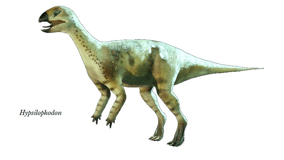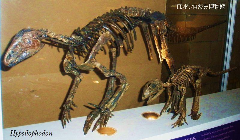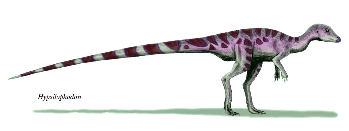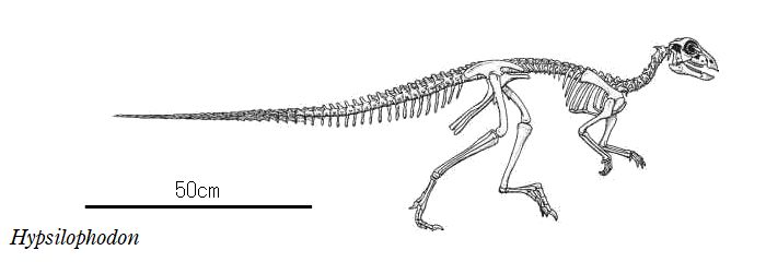 | ヒプシロフォドンは、イギリス、ワイト島、南西海岸にあるカウリーズチンの西の白 亜紀前期(1億3000万年前)のウェセックス累層から、1849年に発見された。化石は、 1個の椎骨、肋骨の一部と烏口骨、骨盤の一部、部分的な後肢、2個の尾椎であった。 ヒプシロフォドンは、前上顎骨歯がある原始的な鳥脚類で、草食性または、雑食性で、 小型で機敏な二足歩行の恐竜であった。その後、頭蓋骨、それに続く背椎骨が発見さ れ、同一の種類であると確認された。鼻腔開口部は、前上顎骨の前突起によって完全 に分離されている。よって、鋭いくちばしを備えた先のとがった頭を持っていた。軽 量で最小化された骨格、低くて空力的な姿勢、長い脚、硬い尾など、二足歩行で走り に徹した体型であった。短い前肢には、5本の指があり、後肢には、4本のつま先が あった。ワイト島で発見された標本以外は、別種の、ヴァルドサウルスに属している とされ、ヨーロッパ各地で発見されたものも異なる種と判断されている。よって、以 前、ヒプシロフォドン科が存在したが、現在は、ヒプシロフォドン単独の派生属とし て扱われている。体長は、1.5m~2m、体重は、20Kgと推定されている。 以下に、ヒプシロフォドンに近縁な属、系統が不明確な属を示す。 ヒプシロフォドンの近縁属等 ① リーエリナサウラ (Leaellynasaura) (オーストラリア・ビクトリア州、白亜紀前期) ② ドリンカー (Drinker) (アメリカ・ワイオミング州、ジュラ紀後期) ③ ヤンドゥサウルス (Yandusaurus) (中国・四川省、ジュラ紀中期) ④ アギリサウルス (Agilisaurus) (中国・四川省、ジュラ紀中期) ⑤ ナノサウルス (Nanosaurus) (イギリス・ワイト島、白亜紀前期) ⑥ ラオサウルス (Laosaurus) (イギリス・ワイト島、白亜紀前期) ⑦ オスニエロサウルス (Othnielosaurus) (アメリカ・ワイオミング州、ジュラ紀後期) |