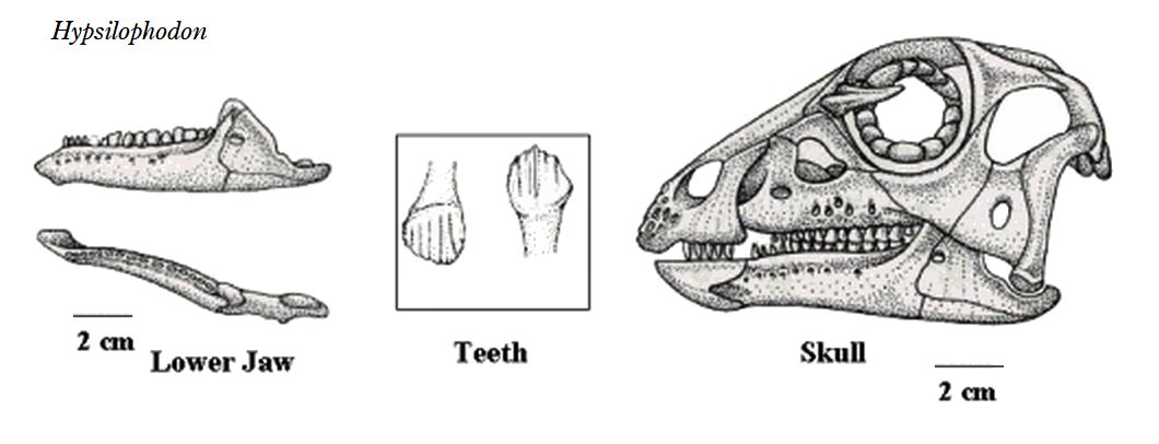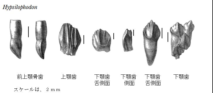| ヒプシロフォドンの歯は、前上顎骨歯が5本あり、上顎骨には、10本から11本の歯、 下顎には、13本から14本の歯が歯列にある。下顎歯の舌側エナメル質の表面は、上 顎歯の頬側表面には存在しない強い中央隆起を有する。顎関節が、歯列の高さよりは るかに低いという共通の派生特性を特徴としている。ハドロサウルスなどと同じで、 下顎歯の頬側に上顎歯が滑り落ちるように咬合する。そのため、下顎歯の頬側には、 広い咬耗面が形成される。上顎歯は、舌側に狭い咬耗面を形成する。歯が顎のはるか 後ろに設定された頭蓋骨の構造は、頬があり、食物の咀嚼を容易にする高度な機能で あったことを強く示唆している。エナメル質の表面に23から27本の垂直の隆起を持 つ上顎歯と下顎歯があり、下顎の歯列は、頬側に湾曲し、上顎の歯列は、舌側に湾曲 しているため、咬合によって自然と研ぎ澄まされ、常に鋭利な刃を形成している。歯 は、交互の配置で継続的に交換され、2から3つの交換波が、顎の後ろから前に移動し た。 |