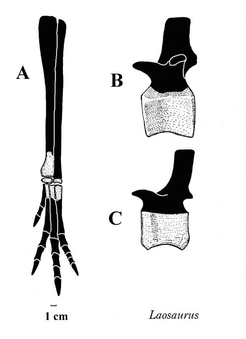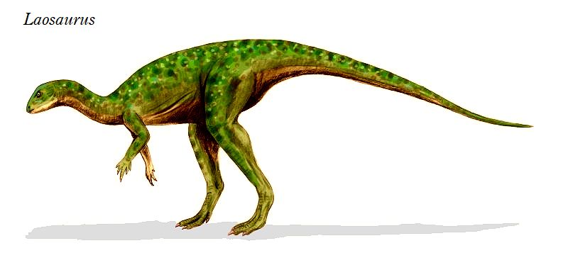 | ラオサウルスは、アメリカ、ワイオミング州、コモブラフ近くの採石場の ジュラ紀後期(約1億5400万年前)のモリソン累層から発見された。タイ プ標本の化石は、1つの部分的な尾椎の椎体と1つの完全な尾椎の椎体で あった。部分的な左下腿も見つかった。マーシュが、ヒプシロフォドン科 の代名詞としてラオサウルス科を作り出したが、化石が、少なく、部分的 なので、現在は、属名は疑わしいとされている。タイプ標本は、ナノサウ ルスやオスニエロサウルスの可能性を示唆している。全長は、約2m、体 重は、約30Kgと推定されている。 |