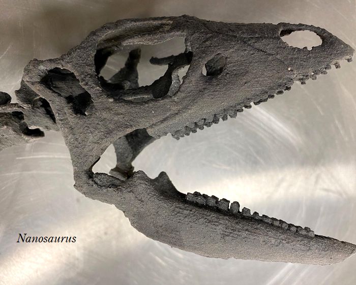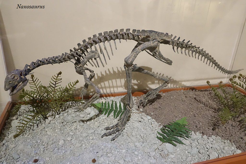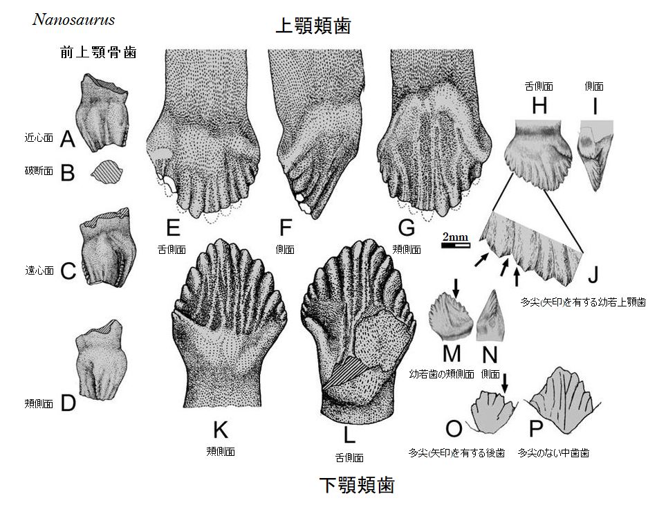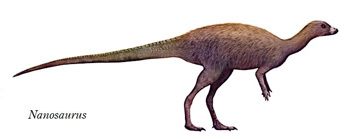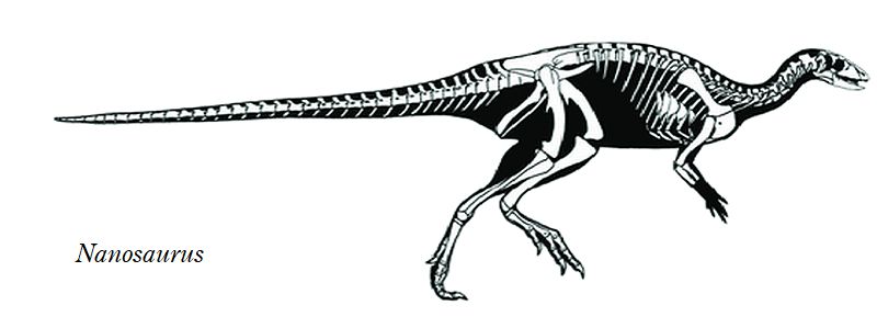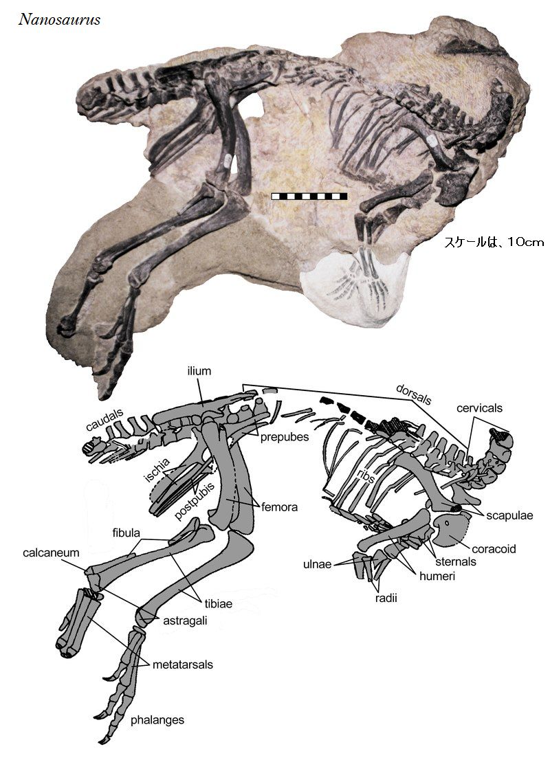 | ナノサウルスは、アメリカ、ワイオミング州、コモブラフ近くの採石場の ジュラ紀後期(約1億5700万年前)のモリソン累層から発見された。小型 で、短い前肢と長い後肢を持つ、二足歩行の草食恐竜である。化石は、頭 蓋骨を除く、体の部分骨格がそろっている。手は広く、指は短かった。頭 は小さかった。歯は、小さな葉の形をした三角形で、前縁と後端に小さな 隆起と歯状突起が並んでいる。前上顎骨には、装飾の少ない上顎前歯を持 っていた。全長は、約2~2.6m、体重は、30~44Kgと推定されている。 |
